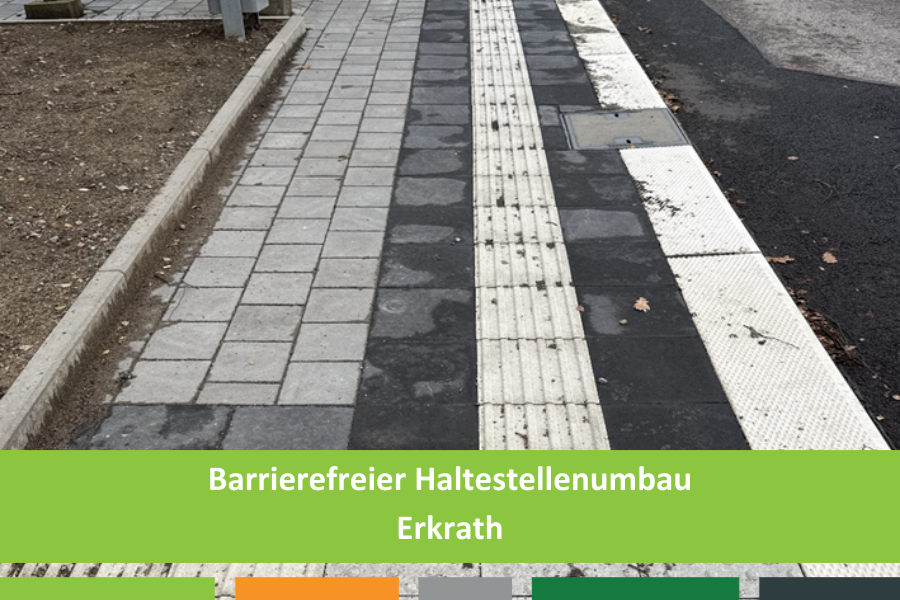 Mit dem erfolgreichen Abschluss der Asphaltarbeiten ist der barrierefreie Umbau der Haltestellen im Stadtgebiet Erkrath vollständig abgeschlossen. Die Maßnahmen umfassten unter anderem das Errichten von Blindenleitsystemen gemäß DIN 32984 sowie den Austausch der vorhandenen Bordsteine durch reifenfreundliche und besonders langlebige „Kasseler Sonderborde“. Insgesamt wurden 11 Haltestellen von uns geplant, ausgeschrieben und während der gesamten Bauphase fachlich begleitet. Dazu gehörten neben der Entwurfs- und Ausführungsplanung auch die Erstellung und Betreuung der erforderlichen Förderanträge.